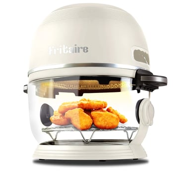 The Fritaire Self‑Cleaning Air Fryer features a tempered glass bowl design which is BPA‑free and PFAS‑free. It contains a 1,300 W convection system and 360° heat circulation to deliver crisp, evenly cooked meals. It also includes a rotisserie, tumbler basket, and air stand, making it versatile and easy to use. The best part? It cleans itself -Just add a bit of soap and water, run the self-clean cycle, rinse, dry, and it’s ready to go again!